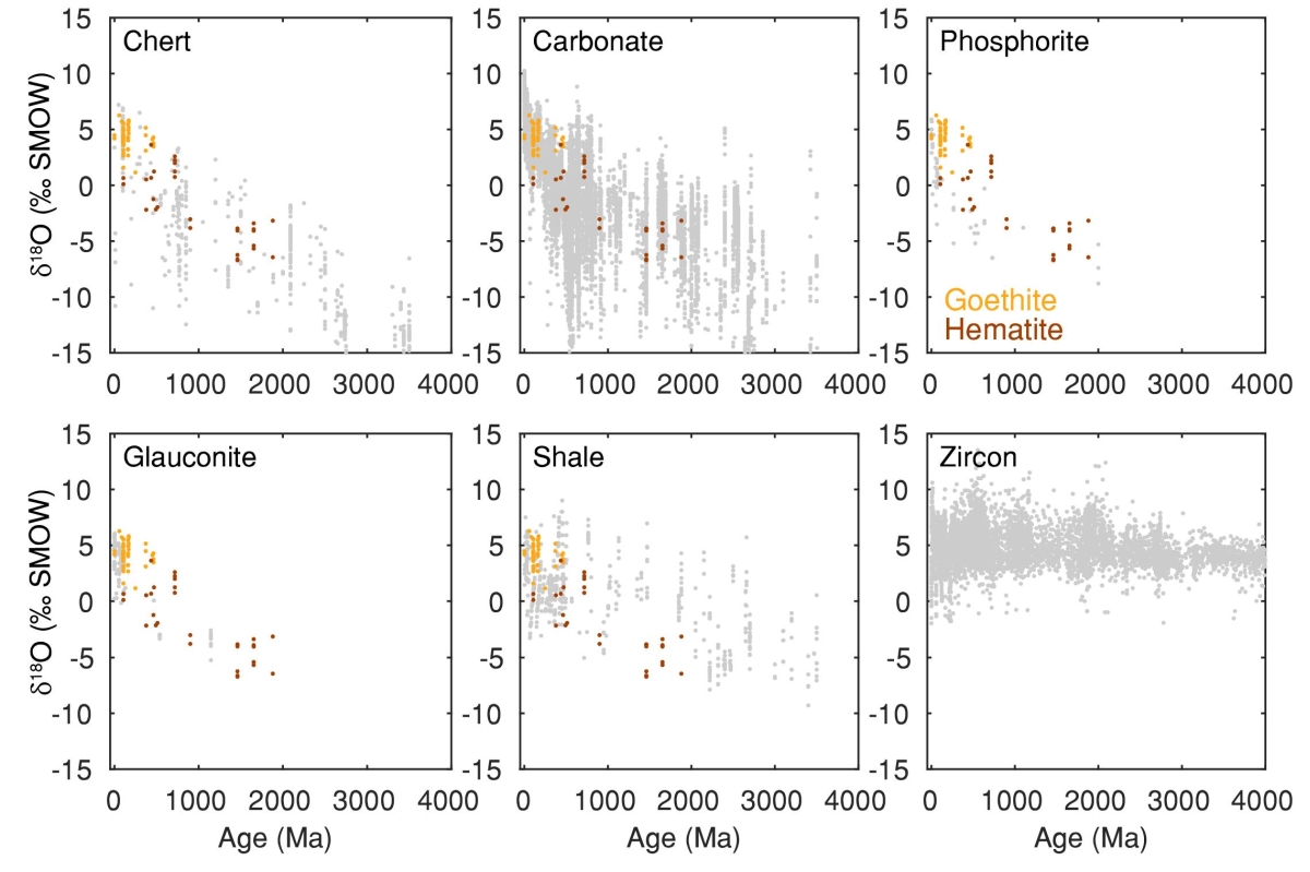 图1 不同沉积岩和矿物的氧同位素随时间的变化趋势,自左至右分别为燧石、碳酸盐岩、磷块岩、海绿石、页岩和锆石(见Galili et al., 2019补充材料)