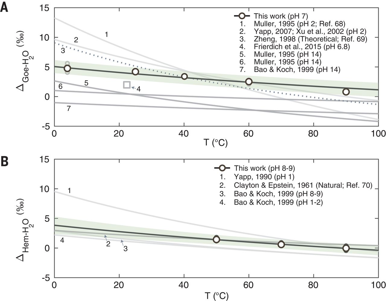 在此背景下,以色列雷霍沃特魏茨曼科学研究所Nir Galili 博士和其合作者最近在Science上撰文认为,氧同位素变化的这种趋势应与海水的氧同位素变化有关,而与海洋温度无关;进而推测,地球早期海洋温度并非像传统认为的会那么高。他们创新性地使用了铁氧化物的氧同位素地质记录来破解这一科学难题,铁氧化物的氧同位素对温度变化不敏感,因此铁氧化物的同位素变化的原因可能为破解各类沉积物和矿物的变化趋势提供正确的解释。尽管前人的研究已经表明温度对铁氧化物和水之间的氧同位素分馏影响是较弱的,沉积后的作用也影响甚微,作者仍开展合成实验,以期证实真实性。他们采用不同的pH值和温度来合成针铁矿和赤铁矿,发现其氧同位素分馏与温度的相关性确实较弱,每20℃仅有~1‰的变化 (图2)。