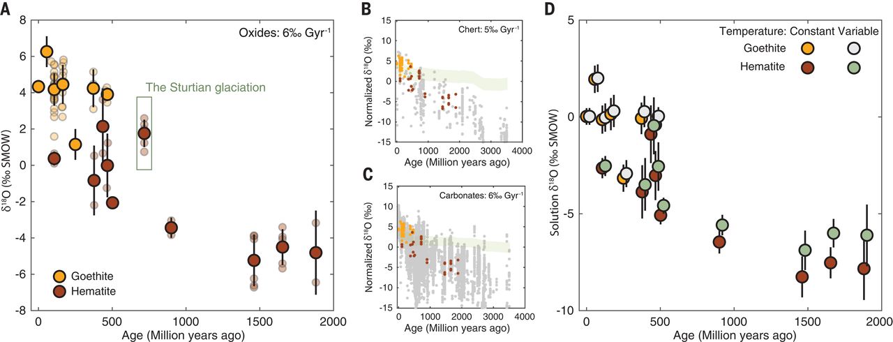 Galili N, Shemesh A, Yam R, et al. The geologic history of seawater oxygen isotopes from marine iron oxides [J]. Science, 2019, 365: 469-473.(链接)
