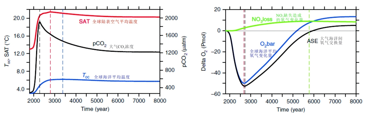 图1 基于UVic模型模拟得到的未来6000年间地球海洋重要参数演化曲线(修改自Oschlies et al., 2019)