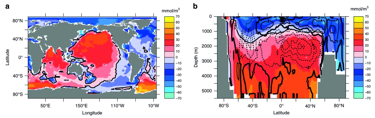 图2 基于UVic模型模拟得到的公元8000年时期的海洋与现今海洋含氧量的对比图(Oschlies et al., 2019)
