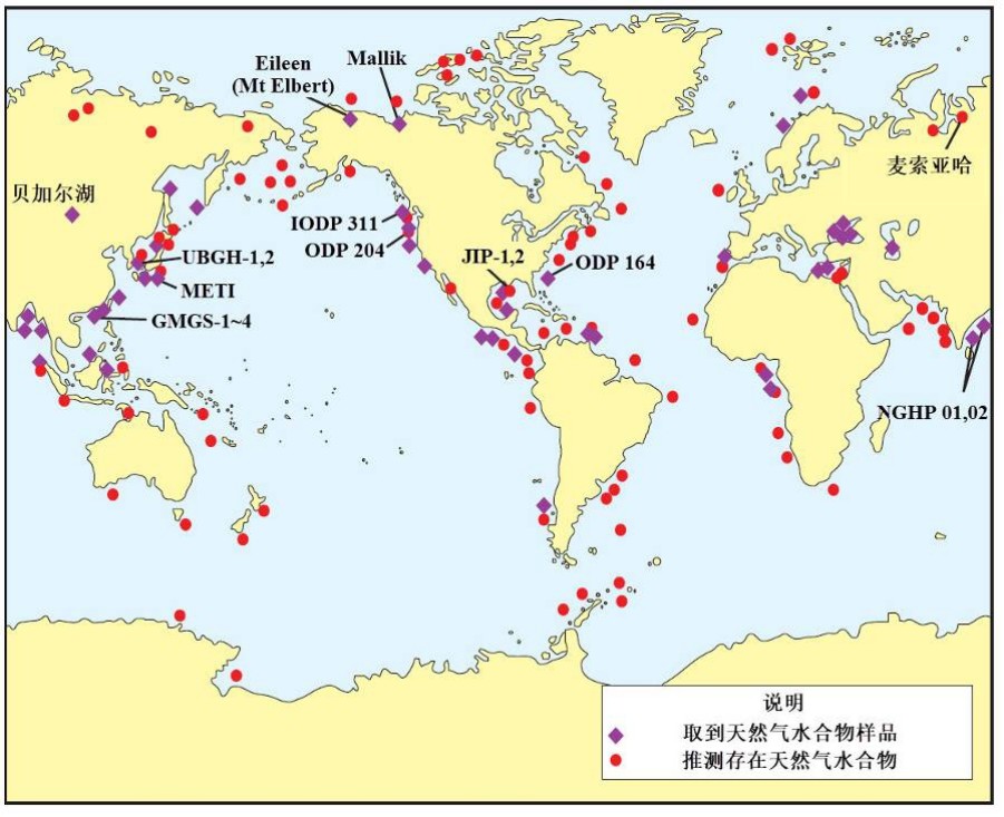 图1 全球已获取水合物实物样品和推测存在水合物的区域分布图
