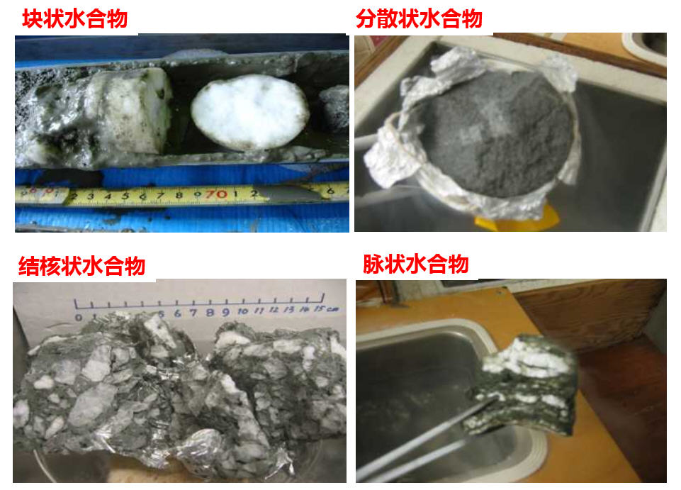 天然气水合物,也称“可燃冰”,是在低温高压条件下,由甲烷和水结合而成的似冰状化合物,主要分布在海洋大陆架边缘和陆地冻土区。1778年,英国化学家在实验室合成了二氧化硫的水合物;1811年,Davey合成了含氯气的水合物;1934年美国科学家首次在输气管道中发现天然气水合物,它堵塞了管道,影响天然气输送;直到20世纪80年代,水合物被视作能源以来,水合物调查研究才得以快速发展,美、日、俄、加、英、德等国以及欧盟均投入巨资进行水合物调查研究,印度、韩国等也奋起直追。全球在浅海沉积物区和陆域冻土区均已获取水合物实物样品,国际深海钻探包括DSDP、ODP、IODP和ICDP等。全球已获取水合物实物样品和推测存在水合物的区域分布如图1所示。通过研究样品发现,自然界中的天然气水合物可以分为块状水合物、分散状水合物、结核状水合物和脉状水合物(图2)。天然气水合物资源金字塔模型定性揭示了各种类型水合物储层的资源潜力和开采难度之间的关系,并在一定程度上为今后水合物试采靶区的选择指明了方向。