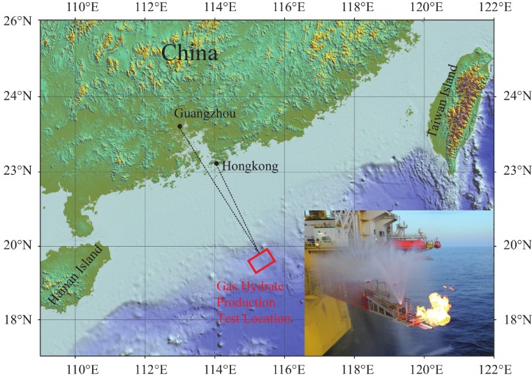 我国天然气水合物主要分布在南海,水合物下伏地层分布有天然气,GMGS(2007)航次成功取得天然气水合物样品。中国南海的天然气水合物开采是目前时间最长的一次开采。南海神狐海域为主要开采试验区,持续60天,最高日产量35000STm3,累计产气量为300000STm3地质条件主要为泥质粉砂,进行流体开采。中国神狐海域2017年试采“四维一体”环境综合监测系统,持续产气时间最长,累计产气量最大,气流稳定,环境安全(图3,图4)。