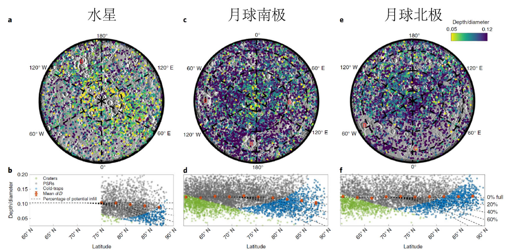 图1 水星和月球极地区域陨石坑。a、c、e.水星北极、月球南极、月球北极地区的陨石坑地图。颜色代表其d/D。b、d、f.水星北极、月球南极、月球北极地区的陨石坑的d/D随纬度的分布。注意,d中N应为S,原文笔误。绿色点代表没有永久阴影区的陨石坑,灰色点代表有永久阴影区的陨石坑,蓝色点代表永久阴影区中可以形成冷阱的陨石坑。红点是某一给定纬度上所有陨石坑d/D的平均值(Rubanenko et al., 2019)
