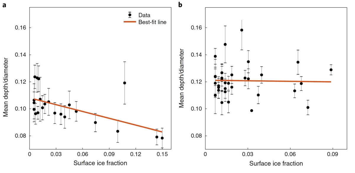 随后,Rubanenko等人将相同的方法应用在了月球上。在月球南极,他们发现了与水星相同的趋势——陨石坑随纬度升高而变浅(图1d);而在月球北极,他们没有发现这一趋势(图1f)。与已发现的表面冰沉积进行的对比显示,在南极d/D与冰含量成负相关,即,冰沉积越多,陨石坑越浅;而在北极,则没有发现这一相关性(图2)。他们认为南极的负相关正是表明陨石坑变浅是由冰沉积所导致的,而北极的陨石坑中也许曾经也有冰沉积物,但是被后续的撞击破坏了。