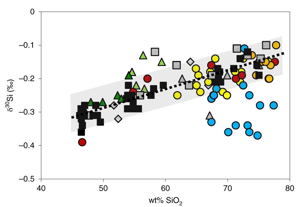 图1 虚线标记的是由Afar和Iceland的岩石(黑方形)分异趋势确定的线性“火成岩趋势线”,其等式为δ30Si(‰) = 0.0056*SiO2(wt%) - 0.567。其中虚线周围灰色的区域是其±0.05‰的不确定度。图中可见,大多地球上的火成岩落在灰色区域中,各种符号代表了来自不同地区不同类型的岩浆岩,只有过铝质S型花岗岩(蓝色圆点)例外,相同SiO2含量情况下这些过铝质花岗岩具有比其它岩浆岩更低的δ30Si(André et al., 2019)