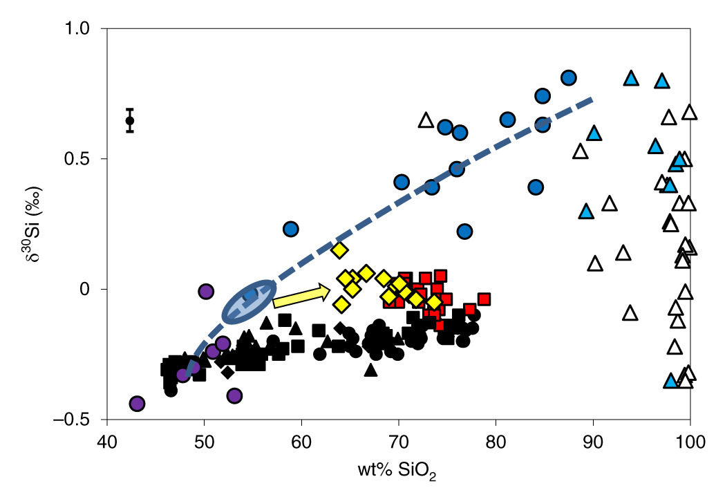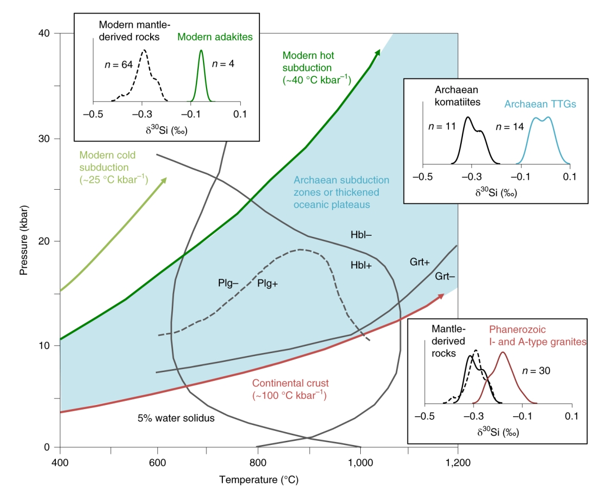 太古代英云闪长岩-奥长花岗岩-花岗闪长岩(tonalite–trondhjemite –granodiorite, 即TTG岩系)是大陆地壳的最主要组成部分,对其成因一直存在很大争议。Nature Geoscience最近同时发表了两篇文章,从硅同位素的角度对早期陆壳的形成机制进行了探讨。其中一篇文章根据非洲Kaapvaal克拉通具代表性的35.1-26.9亿年奥长花岗质和花岗质侵入体具有非常一致的、比现代陆壳岩石重0.1-0.2‰的硅同位素,认为它们的镁铁质源区受到富硅海水不同程度的硅化。奥长花岗质和花岗质岩石分别来源于SiO2含量52-57 wt%和≥60 wt%的硅化玄武岩的熔融。另外一篇文章显示来自格陵兰、加拿大、西伯利亚和斯堪的纳维亚等地的40-28亿年的TTG也具有类似于上述Kaapvaal克拉通奥长花岗质和花岗质侵入体的富重Si同位素特征,作者认为这些TTG是由于俯冲的玄武质洋壳及少量燧石(富重Si同位素)的部分熔融而形成,并由此推断板块俯冲作用在40亿前即已开始。
