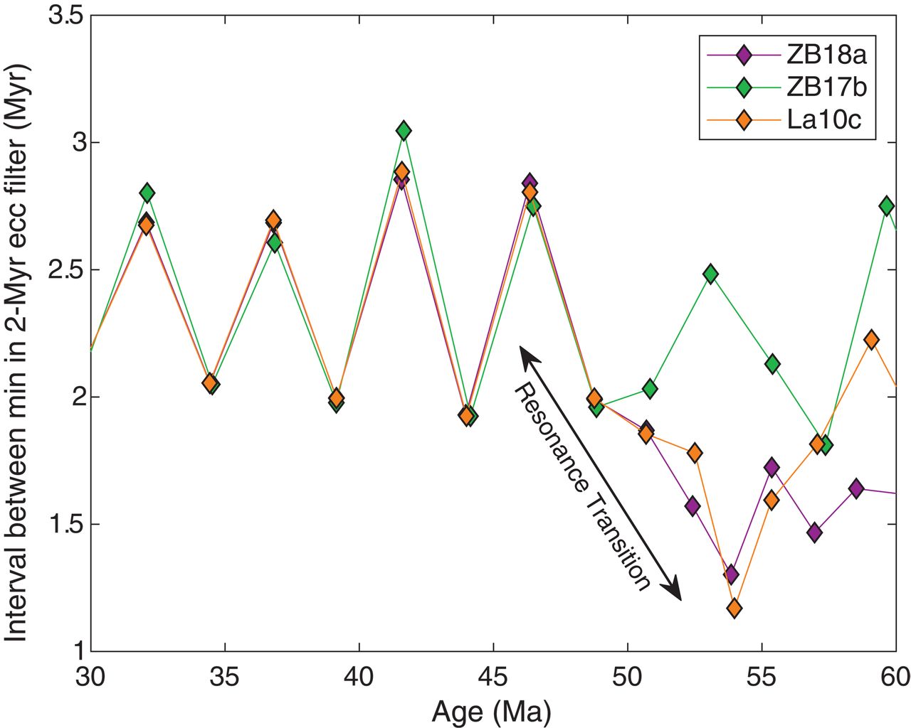 新的天文年代标尺(ZB18a)为PETM事件提供了三点新认识:(1)古新世-始新世界线年龄为56.01±0.05 Ma,明显区别于以往的研究结果(55.5-55.9 Ma)(Weterhold et al., 2007;Charles et al., 2011),为进行全球性生物环境效应对比研究提供了更为准确的时间锚点;(2)PETM事件主体持续时间为170±30 kyr;(3)以往研究认为PETM事件的触发同地球轨道参数的配置没有必然的联系(Weterhold et al., 2007),然而根据新的年代标尺,PETM事件的发生与偏心率最大值时期在时间上是一致的,表明该事件具有天文驱动机制。此外,研究者还发现地球轨道偏心率在~50 Ma呈现出明显的共振转变(图3),进一步证实了该时期太阳系的混沌性特征。