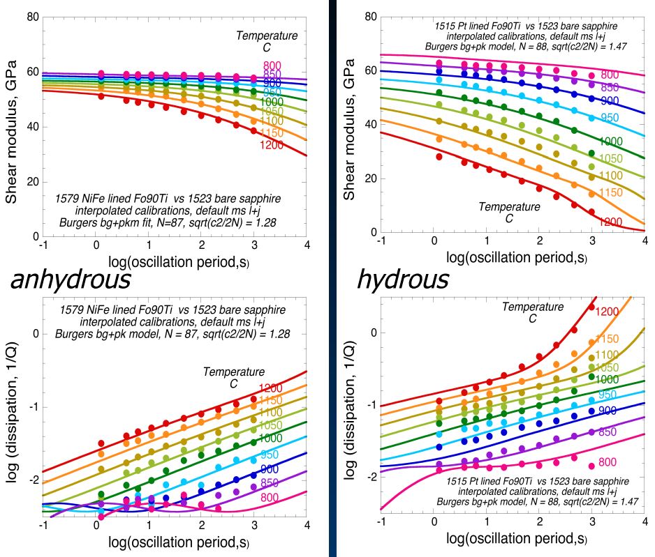 之后,我们继续研究了含水矿物集合体对地震波频散以及衰减作用的影响,从而研究大洋中脊中地震波的频散以及衰减特征。我们通过Fo90Ti的加水实验(图6)发现,矿物集合体含水能够极大的增大地震波的衰减和频散作用,根据研究,我们认为这个现象主要是由于水分子增加了矿物原子结构的缺陷导致的。