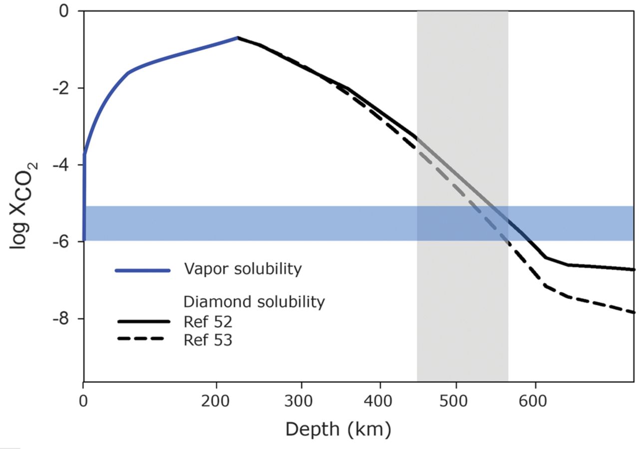 图3 与金刚石平衡的岩浆海的CO2含量(Armstrong et al., 2019)。蓝色曲线代表CO2饱和熔体的CO2含量;黑色曲线代表金刚石饱和的CO2含量,通过两种不同的方法计算(Guillot and Sator, 2011; Duncan and Tsuno, 2017);蓝色阴影部分代表岩浆中CO2含量的变化范围(1-10 ppm);灰色阴影部分代表金刚石在超镁铁质熔体中上浮的环境(Ohtani and Maeda, 2001;Suzuki et al., 1995) |