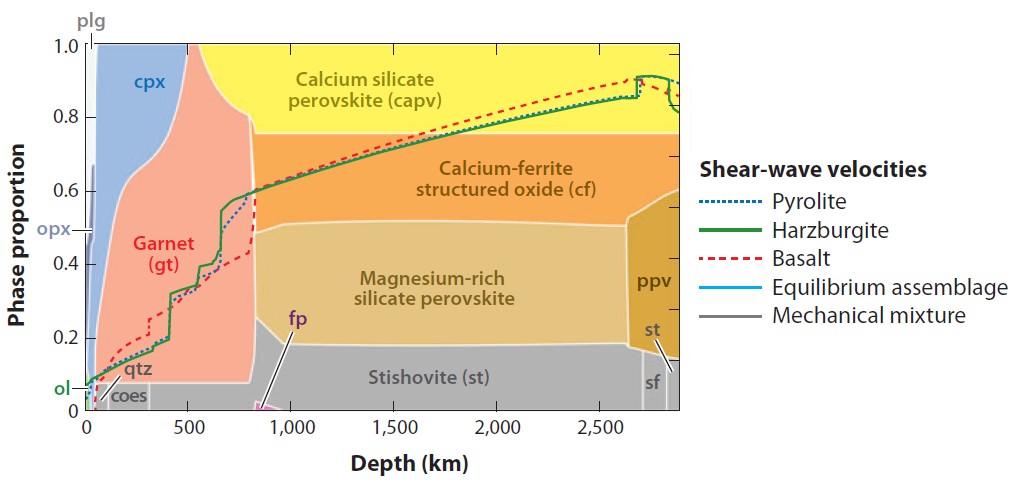 图1 利用热力学模型计算出的玄武岩模型在地幔条件下的矿物组合与横波波速(Stixrude and Lithgow-Bertelloni, 2012)