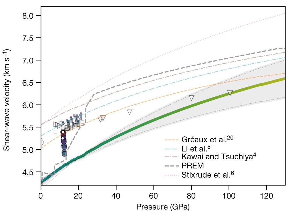Gréaux S, Irifune T, Higo Y, et al. Sound velocity of CaSiO3 perovskite suggests the presence of basaltic crust in the Earth’s lower mantle[J]. Nature, 2019, 565:218-221.(链接)