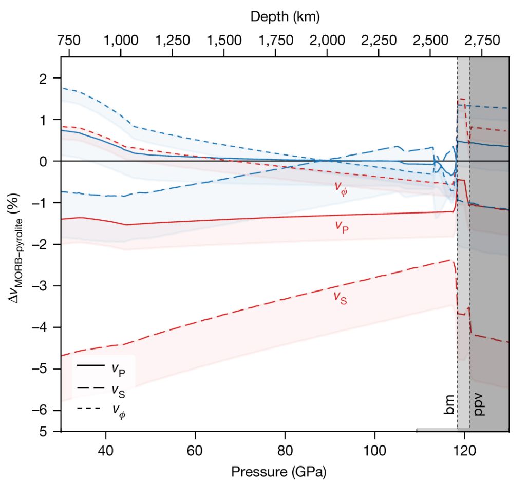 Thomson等的工作源于矿物学的“传统”思路:利用热力学模型计算矿物组合的波速,并将其与实际地震观测数据相比较,从中推算出造成地震波速异常的矿物学成因。如图1所示,用现有的下地幔矿物数据库计算出的玄武岩波速(图1中红色虚线)始终明显大于平均地幔(图1中的地幔岩pyrolite模型)。他们注意到,该数据库中默认CaSiO3钙钛矿(以下简称为CaPv)为立方晶体,并且参数主要来自于对第一原理模拟数据的拟合,但最近的高温高压实验表明,立方结构CaPv的实际横波波速也许要远低于理论模拟结果(Gréaux et al., 2019;参见前沿报道《立方结构CaSiO3钙钛矿的声速原位测量及对下地幔顶部物质成分的启示》 )。由于CaPv在俯冲带玄武岩矿物组合中的占比可达20%以上(如图1),因此现有热力学模型显然高估了洋壳深俯冲物质的横波波速。