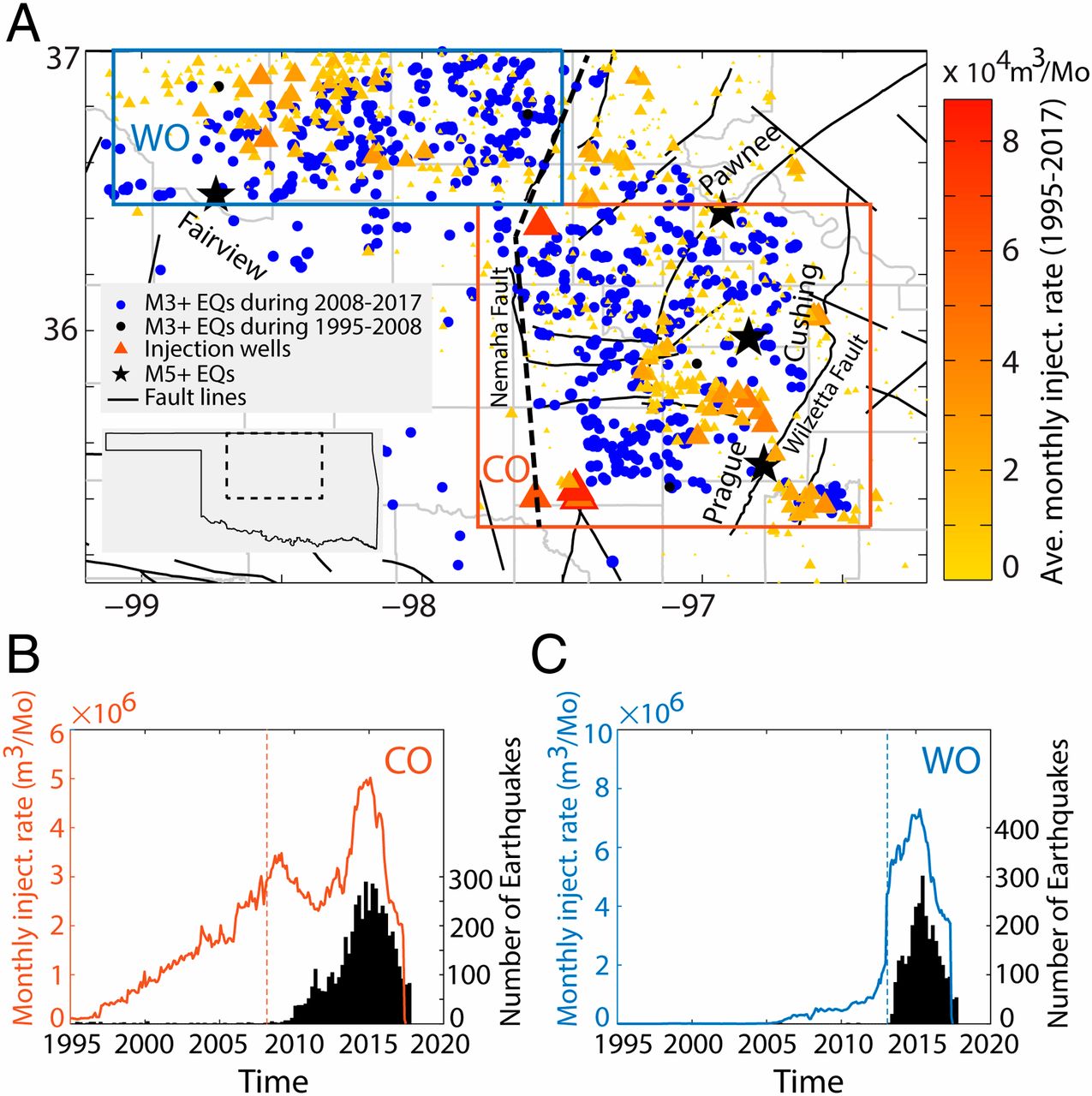 图1 1995年至2017年美国俄克拉荷马州流体注入和地震活动。A.3级以上地震及废水注入井位置。蓝色圆圈表示2008-2017年期间地震,黑色圆圈表示2008年之前地震,三角形代表注入井(根据平均月注入率进行着色和缩放),黑星表示5级以上地震,黑实线是断裂位置,黑色虚线是Nemaha断层带和隆起区,其将俄克拉荷马分为中部(CO,红色框)和西部(WO,蓝色框);B.俄克拉荷马中部地区每月总注入量(红线)与地震活动(黑色直方图);C.俄克拉荷马西部地区每月总注入量(蓝线)与地震活动(黑色直方图)(Zhai et al., 2019)
