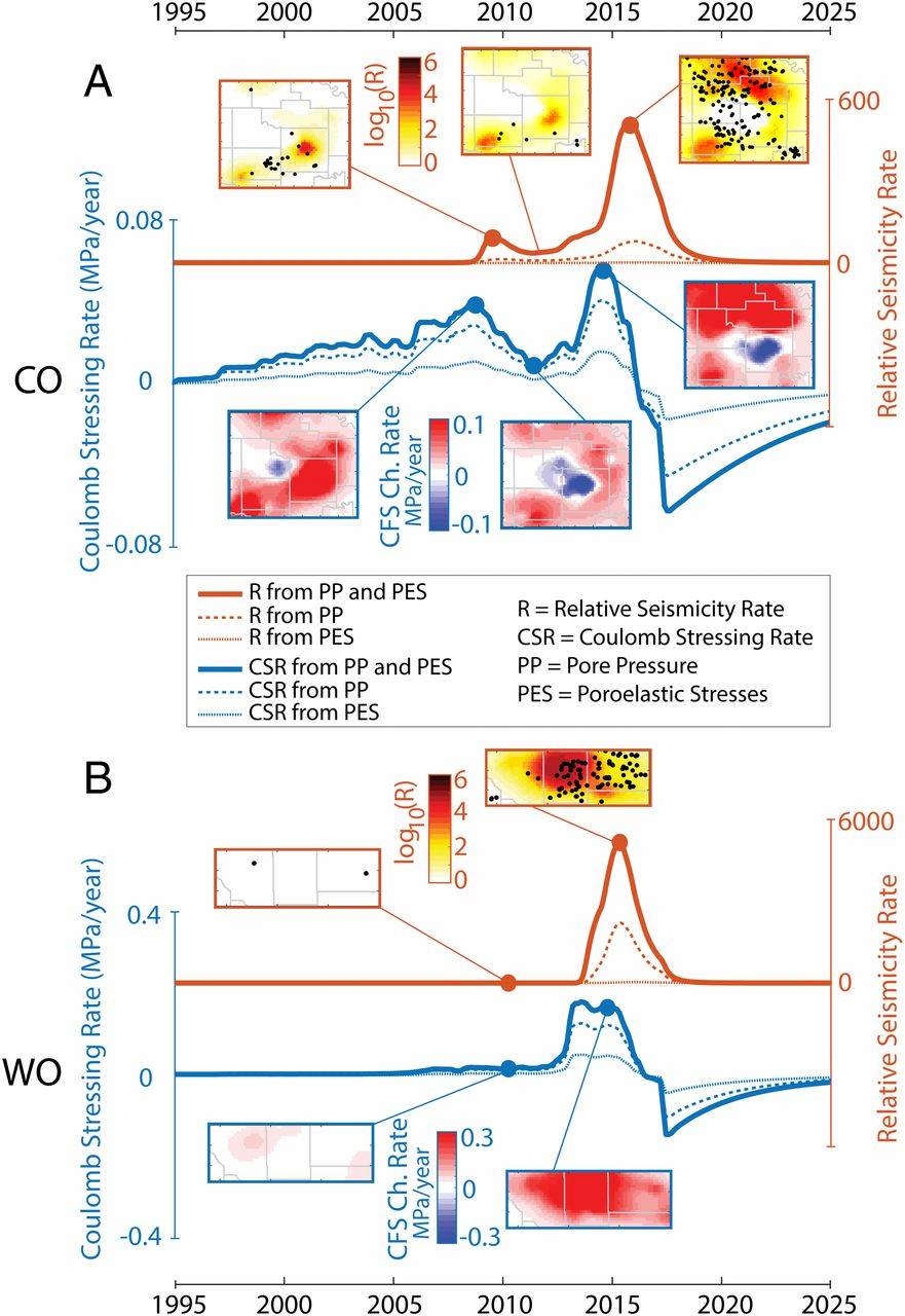 该研究认为孔隙压力扩散引起的断层带应力扰动是俄克拉荷马州诱发地震的主要驱动力,而孔隙压力扩散作用又因多孔弹性应力被强化。研究突出了在多孔弹性介质中流体扩散对诱发地震灾害时空演变的关键作用,因此将流体扩散机制与地震成核机制相结合对诱发地震预报具有重要意义。