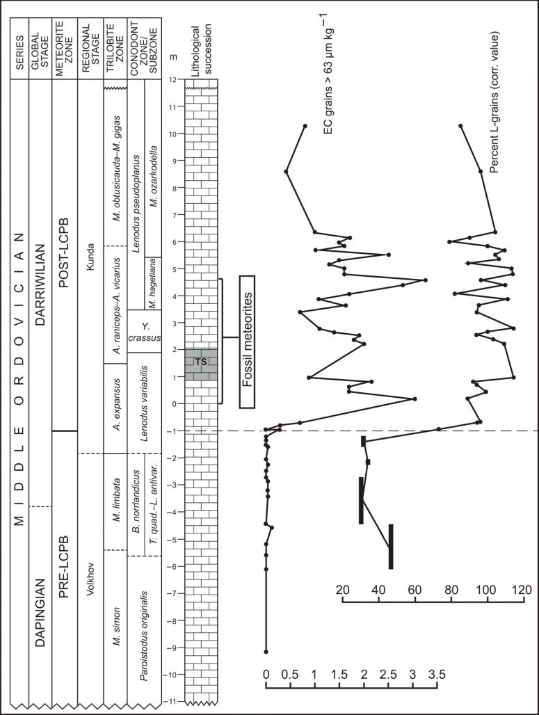 图2 H?llekis-Thorsberg剖面中平衡态普通球粒铬铁矿颗粒(EC)的分布特征。TS:T?ljsten低位沉积(Schmitz et al., 2019)