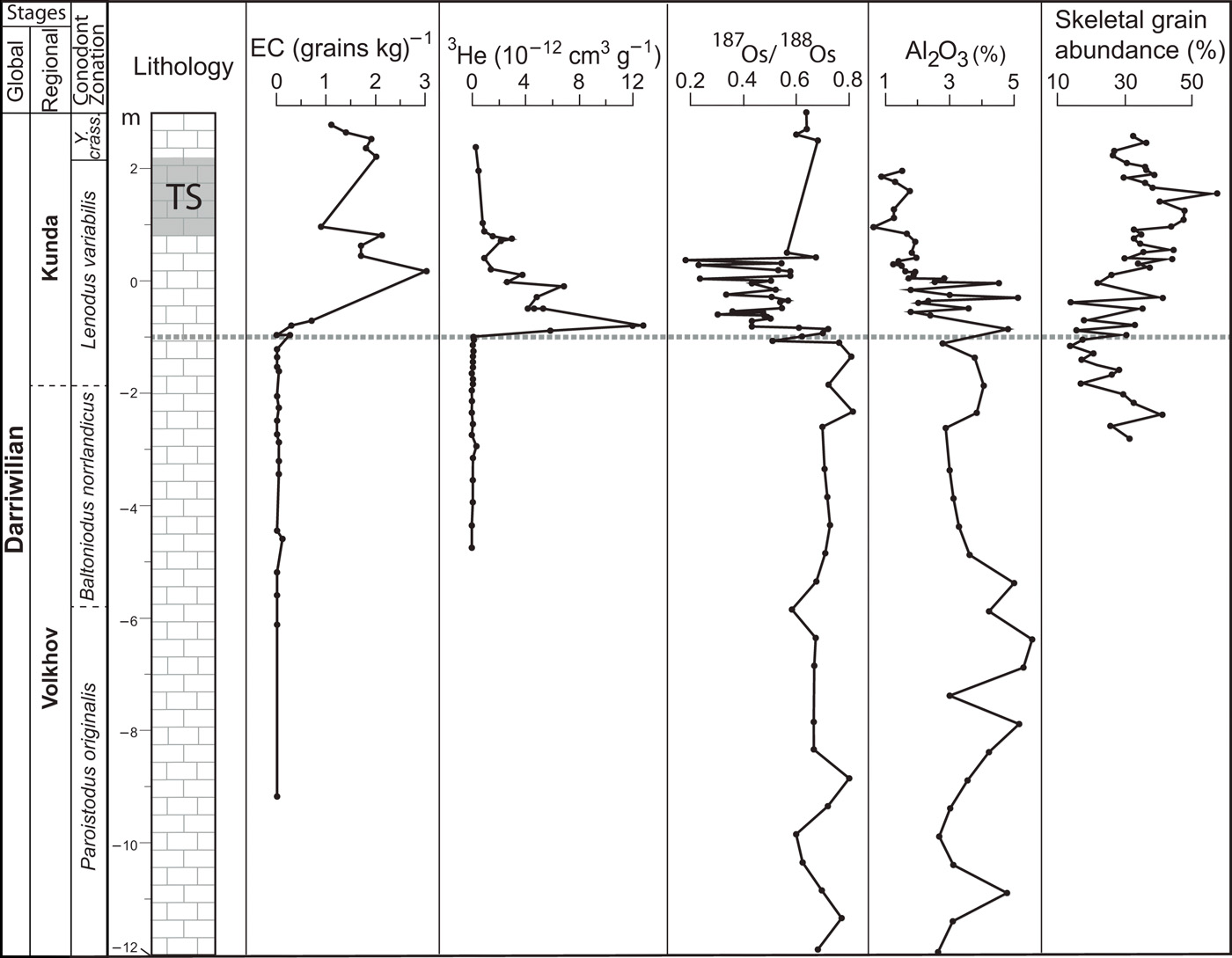 图3 H?llekis剖面下部平衡态普通球粒铬铁矿颗粒(EC)全岩丰度、3He、Al2O3含量以及187Os/188Os比值,生物骨骼碎屑颗粒的丰度(据Lindskog et al., 2014, 2017)