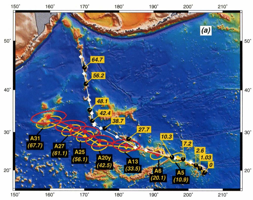 图2 Hawaiian-Emperor链上不同年龄的海山和火山的位置(黑点),以及理论重建的位置(红点和黄点分别代表不同理论模型重建的位置,红/黄圈大小表示理论预测的误差范围)(Raymond et al., 2000)