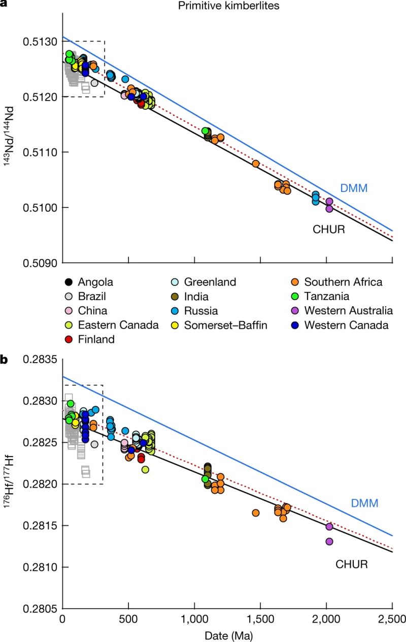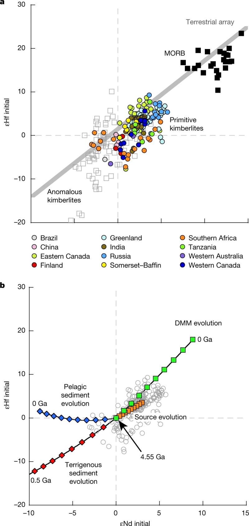Woodhead J, Hergt J, Giuliani A, et al. Kimberlites reveal 2.5-billion-year evolution of a deep, isolated mantle reservoir[J]. Nature, 2019, 573(7775): 578-581.(链接)