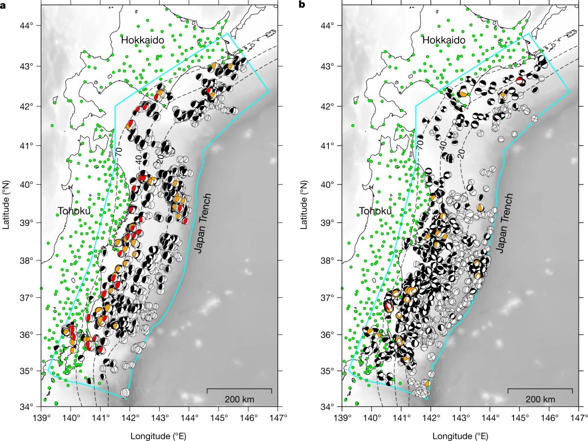 作者选取日本海沟附近2002年6月至2018年4月期间2518个大地震(矩震级Mw > 4.5)。将它们分类为俯冲型和其它型地震(见图1),分别同位置相近小震(Mw < 4.0)进行比较,通过计算大地震和小震垂直向波形信号前0.2秒的相关系数(CCmax),确定两者间的相似度,最终发现了80个异常相似和390个非常相似的地震对(见图2)。这些地震对位置间距非常小,在大约100米范围内。据此,作者认为在研究区内这些大地震和小震破裂起始至少在观测数据使用频段范围内是相似的,并推断地震最终震级与其破裂起始并不相关。
