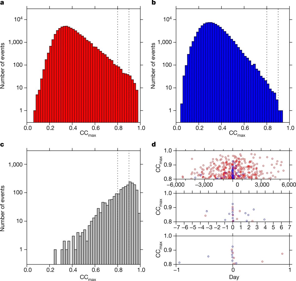 图2 不同类型事件对相关系数CCmax直方图。(a) 俯冲型地震,图中虚线分别表示,CCmax = 0.8和CCmax = 0.9;(b) 其它型地震;(c)重复型地震;(d)三种不同的地震对时间间隔:整个周期(上),1周(中),1天(下)(Ide, 2019)
