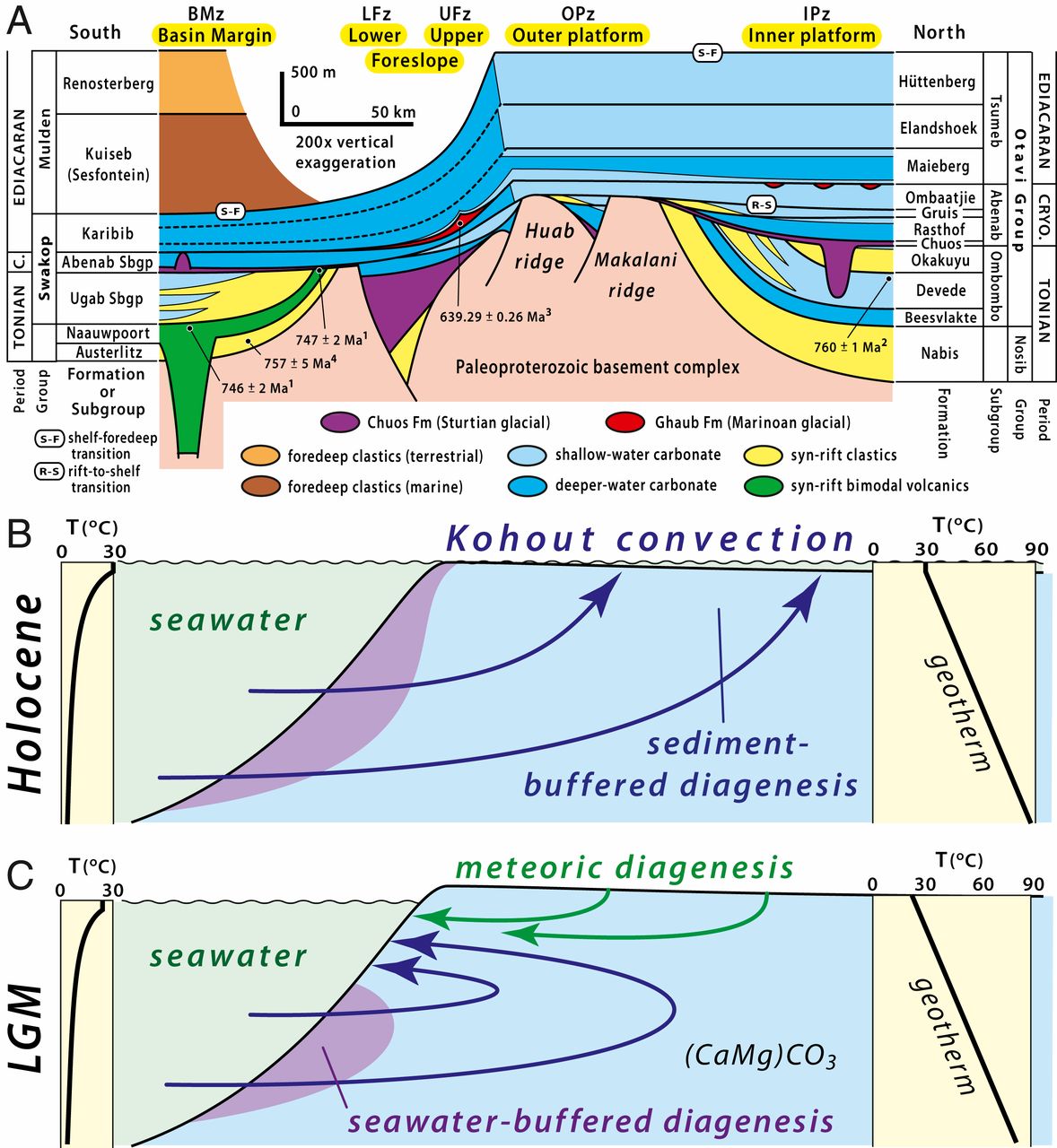 图2 (A) 0.59-0.77 Ga期间,纳米比亚Kunene地区Otavi/Swakop群碳酸盐岩台地构造沉积图(垂向放大200倍)。(B) 海平面高位期(例如全新世)理想的孔隙水对流模式图。流体主要受台地内部海水与孔隙水的温度(密度)梯度驱动。海水主控成岩作用主要发生在斜坡地区,而沉积物主控成岩作用主要发生在台地内部。(C) 海平面低位时期(例如末次冰期鼎盛期)成岩作用模式图。上斜坡受海水与大气淡水的协同影响(Hoffman and Lamothe, 2019)