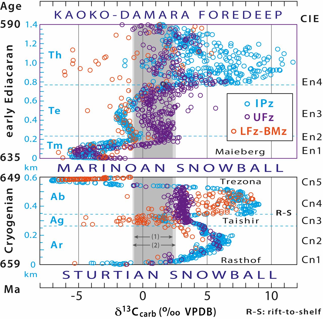 图3 新元古代成冰纪间冰期(Nonglacial Cryogenian,659 to 649 Ma)和埃迪卡拉纪早期(early Ediacaran, 635 to 590Ma)纳米比亚Otavi/Swakop群不同沉积环境的碳同位素剖面对比图。Cn1-Cn5;En1-En4代表δ13Ccarb漂移(Hoffman and Lamothe, 2019)