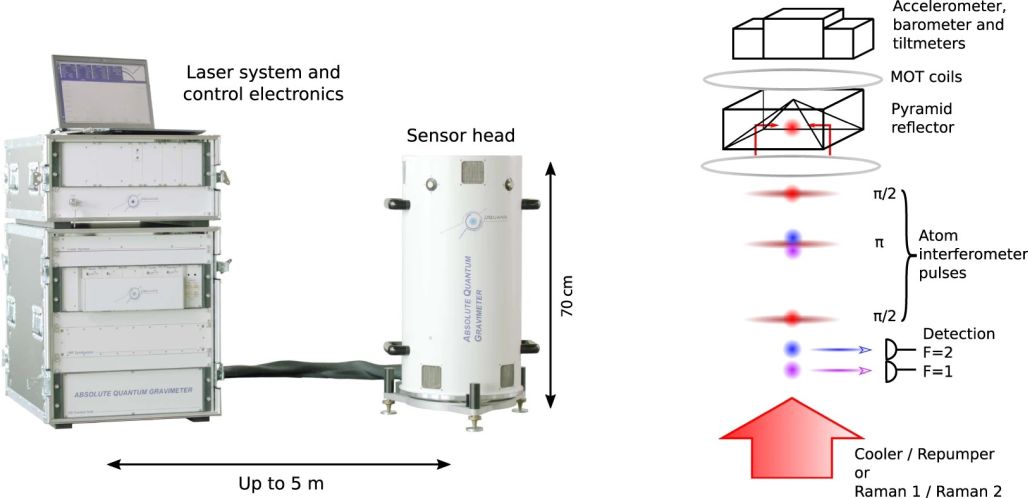 图2 量子重力仪:左图为AQG-A01系统实物图,右图为传感器测量原理图(Ménoret et al., 2018)