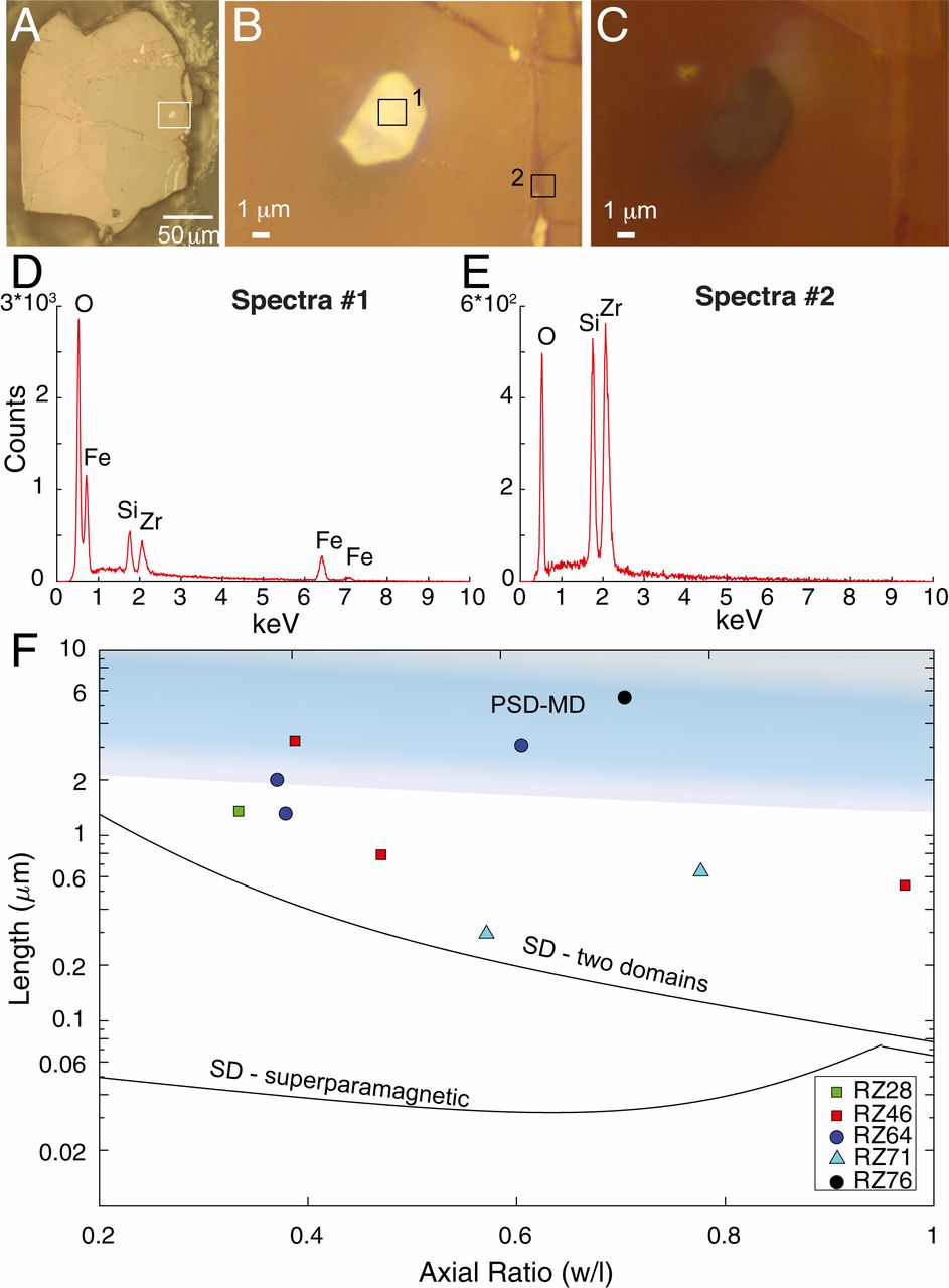 图1 A-C.反射光下锆石的表面特征,显示锆石包裹体位于锆石晶体内部;D-E.不同点位X线衍射能谱分析,点位位于B中;F.磁铁矿颗粒粒径分布图