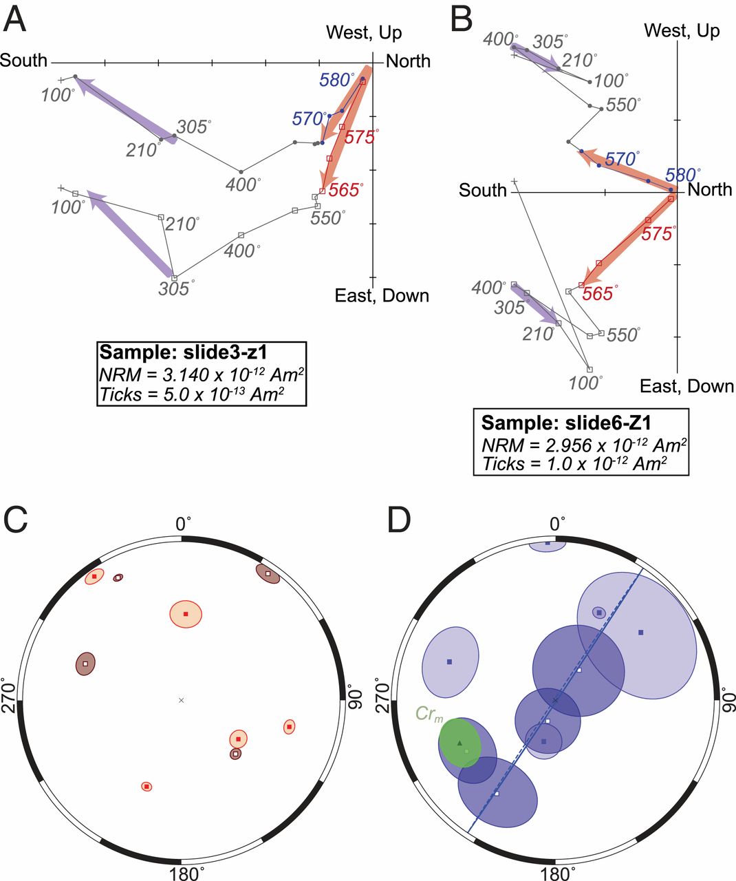 图2 Jack Hills碎屑锆石古地磁结果。A-B.正交坐标系下逐步退磁结果,显示低温和高温剩磁分量;C.高温剩磁分量的微砾石检验,高温剩磁方向分散分布,通过微砾石检验说明高温剩磁是原生的;D.低温剩磁方向投影显示低温分量与高温分量不同,指示可能为后期重磁化过程中获得