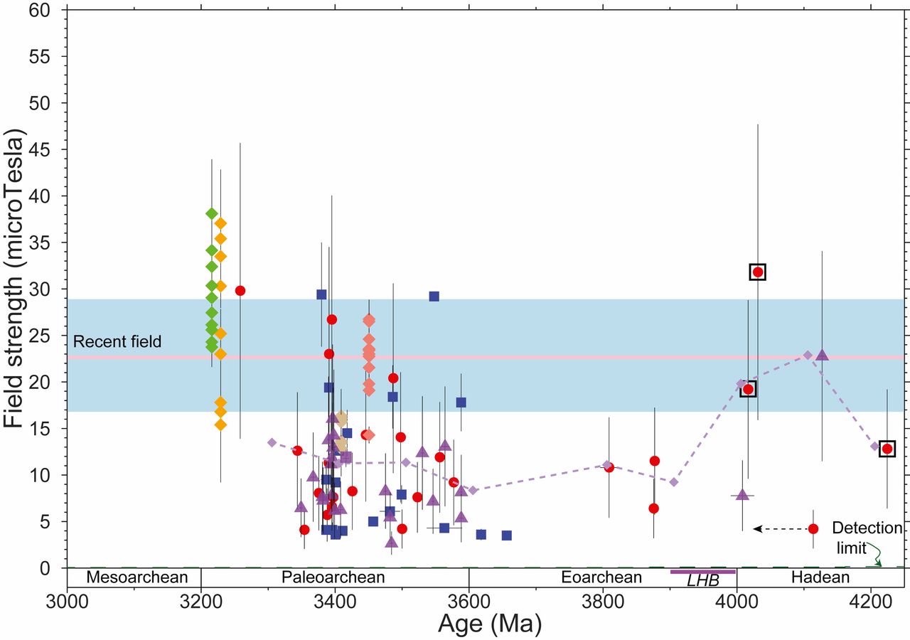 图3 Jack Hills碎屑锆石古强度-年龄分布图。紫色方块和三角形为本研究新增结果,紫色菱形为100-Myr滑动平均。冥古宙-古太古代(4.2-3.3 Ga)地磁场强度为现今赤道地磁场强度的1.0-0.12倍