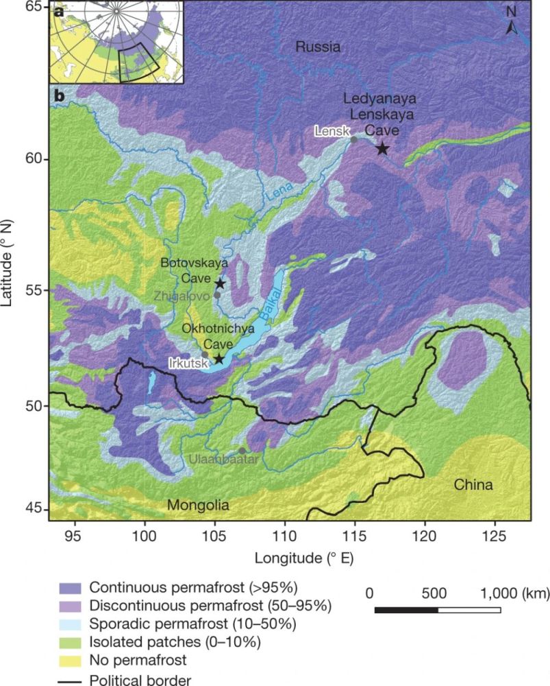 2013年,以色列地质调查局Vaks et al.(2013)对位于现在整个区域全年都是冻土的连续永久冻土带的Ledyanaya Lenskaya洞(图1)里的沉积物进行年代学研究后发现,最近的永久冻土融化发生在42.9±2.3万年前,即海洋同位素阶段(MIS)11的温暖期。然而,该研究由于受到U-Th最老约50万年的定年限制(Cheng et al., 2013),没有对较老洞穴沉积物样品的年代进行分析。最近,Vaks et al.(2020)利用U-Pb定年法对该洞的11个洞穴沉积物进行了年代测定,共获得52个U-Pb年龄,从而扩展了西伯利亚永久冻土演化历史的年代范围,同时,他们对稍微靠南温暖一些的Botovskaya洞中的3个洞穴沉积物也进行了少量年代测定。研究成果发表于Nature。