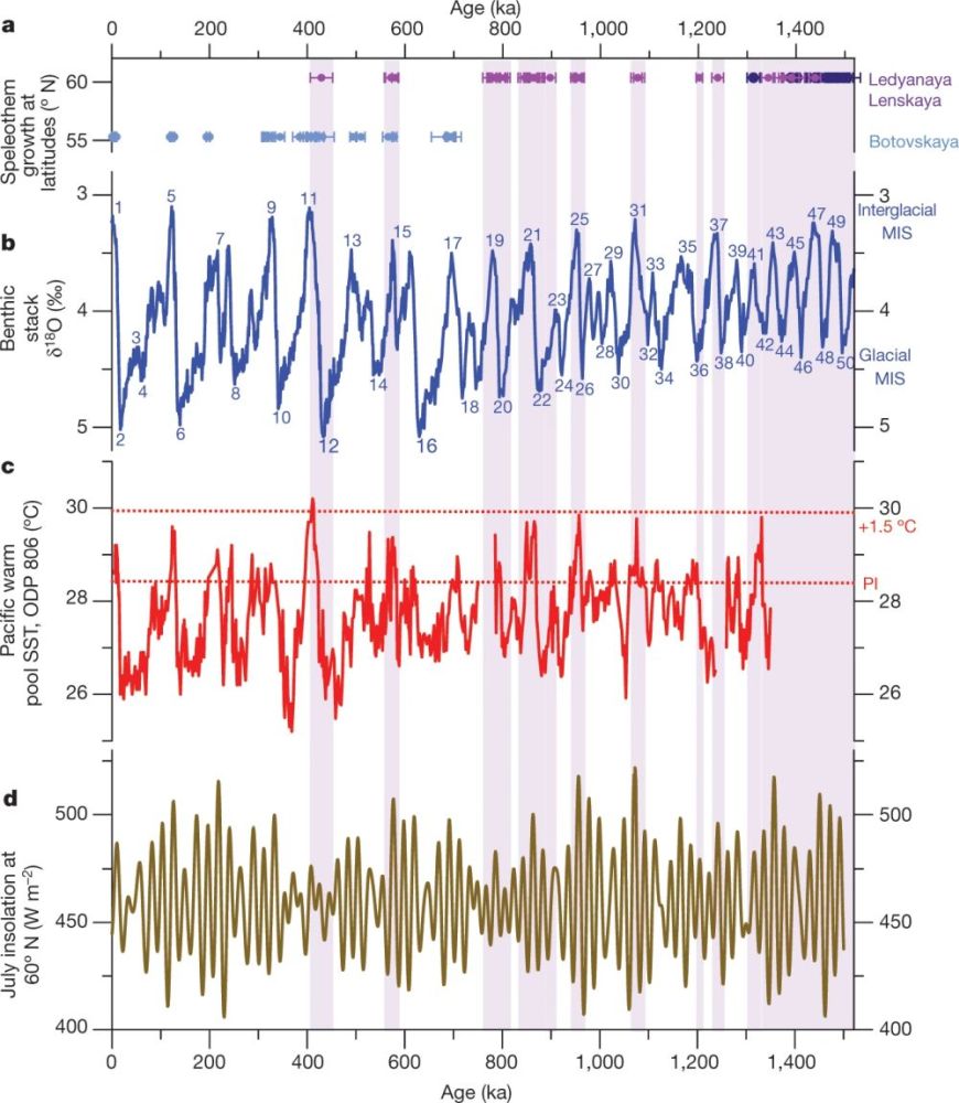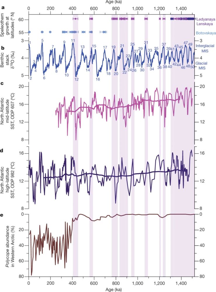 作者将利用Ledyanaya Lenskaya洞穴沉积物重建的西伯利亚永久冻土的演化历史与其它古气候记录进行对比(图2,图3),推测了永久冻土可能的控制因素。在MIS 11之前,虽然全球平均温度(由太平洋暖池海表温度推测)低于MIS 11(例如MIS 25、19和15),甚至比现在还要低(例如MIS 23),但却有大量洞穴沉积物生长,说明全球平均温度并不是西伯利亚永久冻土的唯一控制因素。其他可能的控制因素包括:当地夏季太阳辐射,古地理变化,较强的北半球的极向热传递引起北大西洋、北极或欧亚大陆相对温暖,或北冰洋海表温度和北极夏季海冰覆盖范围。但是研究发现:当地夏季太阳辐射与永久冻土消融之间并没有直接关系,整个过去150万年间冰期北极古地理状况与现在相似,洞穴沉积物生长与北大西洋变暖也没简单的关联性(图2,图3)。令人惊讶的是,自40万年以来西伯利亚连续的永久冻土与北冰洋常年海冰出现的时间却非常一致(图3)。常年海冰的出现以与海冰相关的生物群系在北冰洋西部突然增加和现存在于北大西洋的生物群系从北冰洋消失为标志。