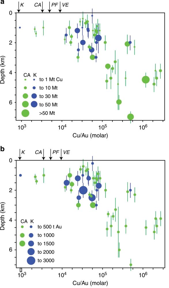 多年来,研究者一直致力于探索究竟是哪些因素决定了斑岩铜矿的规模和Au/Cu比值。然而,由于各斑岩铜矿都有着差异的岩浆组成(岩浆房规模、岩浆含水量、含铜量、含金量)和成矿过程(成矿作用持续时间、成矿深度、金属沉淀效率),致使探讨决定斑岩铜矿的规模和Cu/Au比的主要因素变得十分困难。