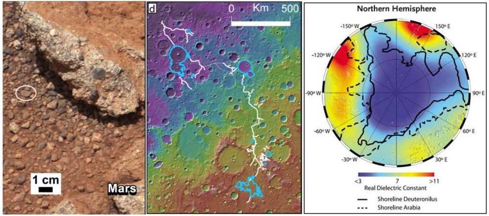 图1 火星表面观测到的很可能由流水形成的砾岩,以及河流、湖泊(Fassett and Head, 2008)和海洋(Mouginot et al., 2012)的地质证据