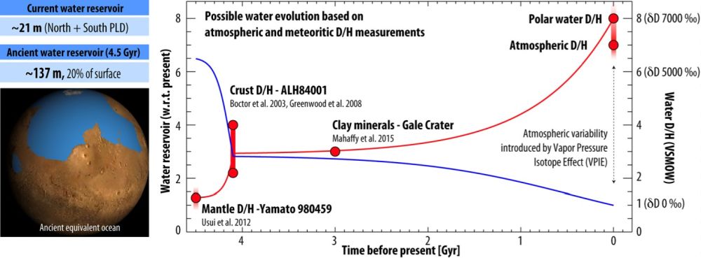 图2 火星陨石、大气和极盖区水中观测到的同位素氘氕比(D/H)变化(红线),推算出火星从40多亿年前到现在的水储量变化(蓝线)(Villanueva et al., 2015)