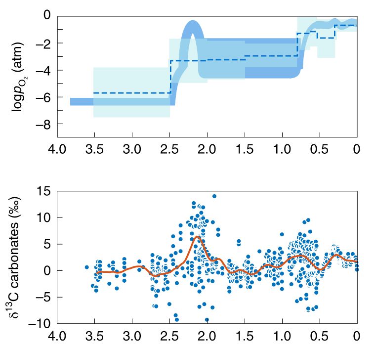 二氧化碳和氧气是影响地球宜居性的两种关键气体。从地球诞生到现今宜居地球的形成,现有的大气成分是三十几亿年以来光合作用和化学合成作用能量存储的结果(汪品先等,2018):在距今23亿年前,地球大气中的氧气含量很低(~0.001%),CO2-H2O混合大气浓厚(Lyons et al., 2014),类似今天的金星大气;然而在~23-20亿年左右,大气中的氧含量增长了若干个数量级,上升到现今水平的15%左右。这个重要的环境转折事件被地球科学家称为大氧化事件(Great Oxidation event,GOE)。地球科学家同时发现,紧随大氧化事件之后,海相碳酸岩的碳同位素δ13C曲线产生了大约10‰正漂移,这个事件则被称为Lomagundi事件。