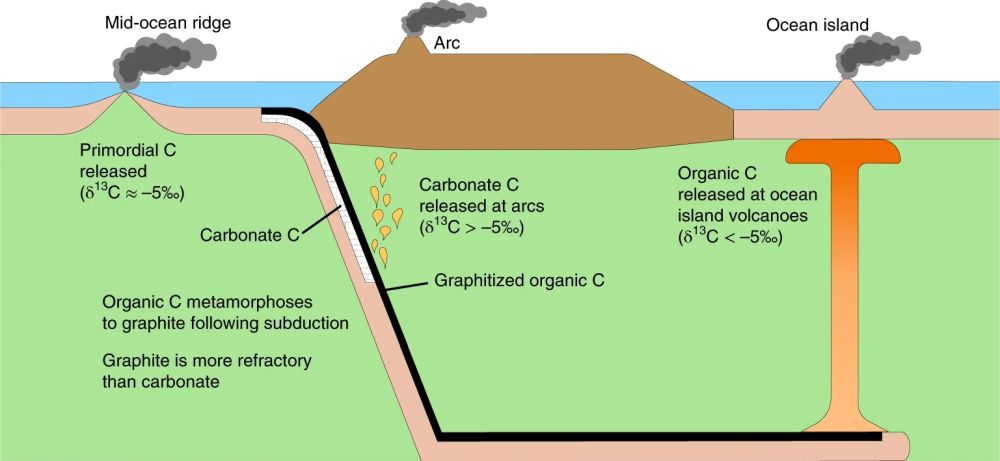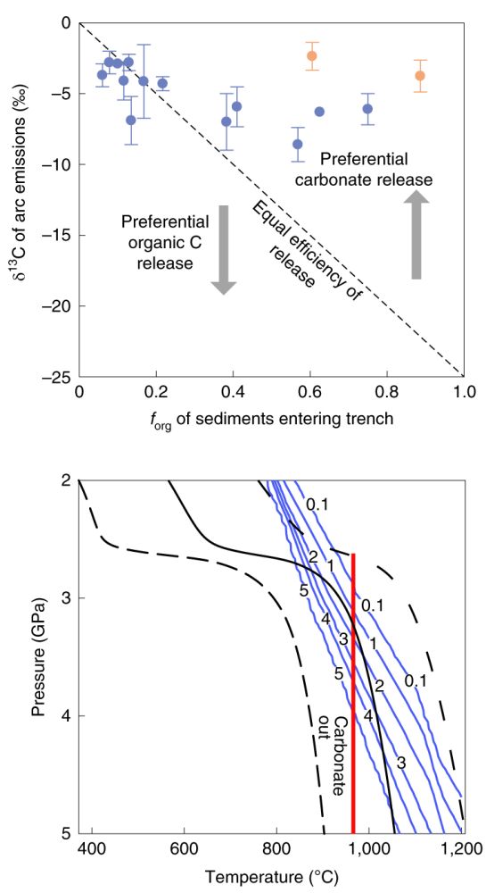 高地幔温度条件下,更强的碳酸岩排气导致俯冲板片更加富集有机碳。有机碳以难溶的石墨或金刚石的相态,可以被俯冲板片携带到地幔深部甚至是核幔边界,这使得地幔深部成因的洋岛玄武岩更加富集有机碳。由于这个喷发过程延迟于俯冲过程(取决于地幔柱的喷发时间),因此可以导致海相碳酸岩的碳同位素δ13C曲线在经历正漂移之后能回归到正常水平(~0‰)。