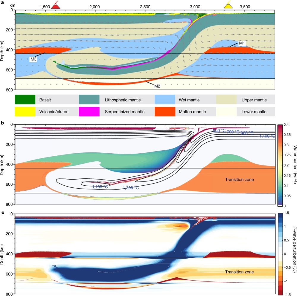 研究者设计的动力学数值模型结果表明:当俯冲板块与湿的地幔过渡带发生相互作用时,会将地幔过渡带的水挤出,这些水之后进入上下地幔,从而促发部分熔融,形成地震波低速异常及海沟前方的内陆火山(图2)。随着板块后撤,更多的含水地幔流进入上地幔,在海沟后方发生脱水熔融,进而形成petit-spot火山。
