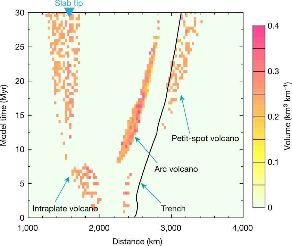 通过动力学模拟优选模型,发现火山岩的时空变化具有这些特征:大陆一侧,距离海沟越远,火山岩越年轻;海沟后方,距离海沟越远,petit-spot就越年轻(图3)。值得注意的是,该模型假设地幔过渡带含水是均匀的,从而使火山岩和petit-spot呈现较好的时空关系,如果过渡带的含水不均匀,可能就会打破这种时空关系。因为只有含水量足够多的区域才能发生熔融,不含水或者含水量不足的区域不能发生熔融,也就是说,如果含水量不足,即使地幔转换带的物质因对流进入上地幔,也不能形成火山岩。