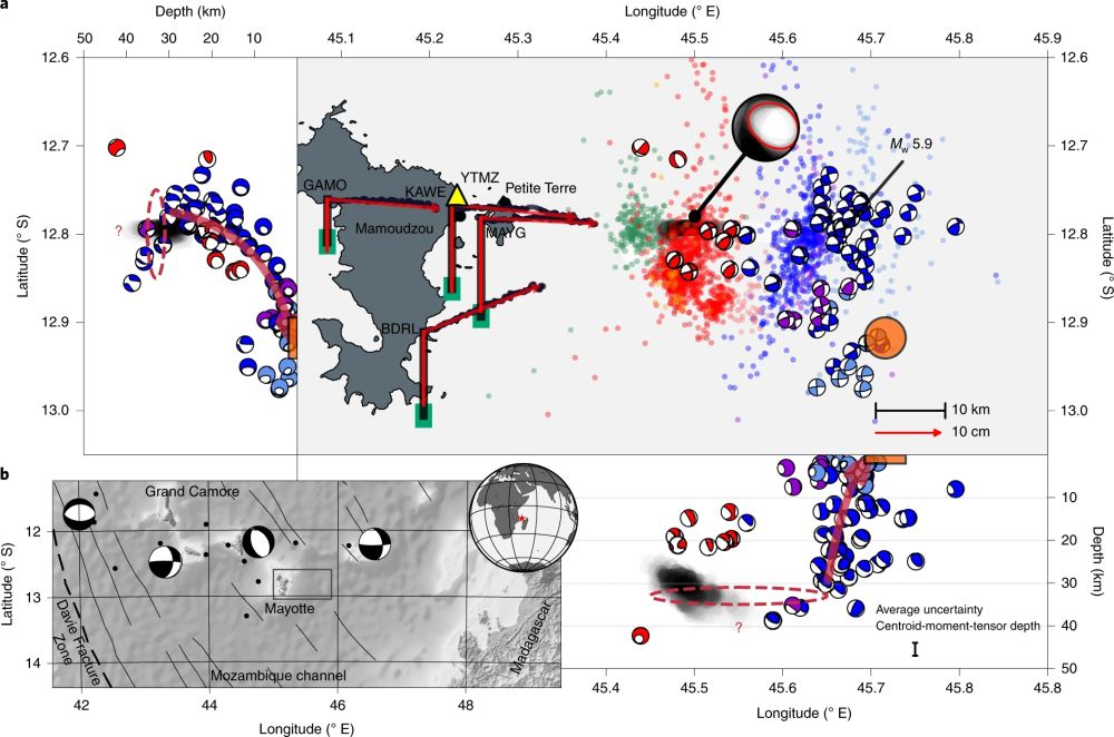 Cesca S, Letort J, Razafindrakoto H N, et al. Drainage of a deep magma reservoir near Mayotte inferred from seismicity and deformation[J]. Nature Geoscience, 2020, 13(1) : 87-93.(链接)