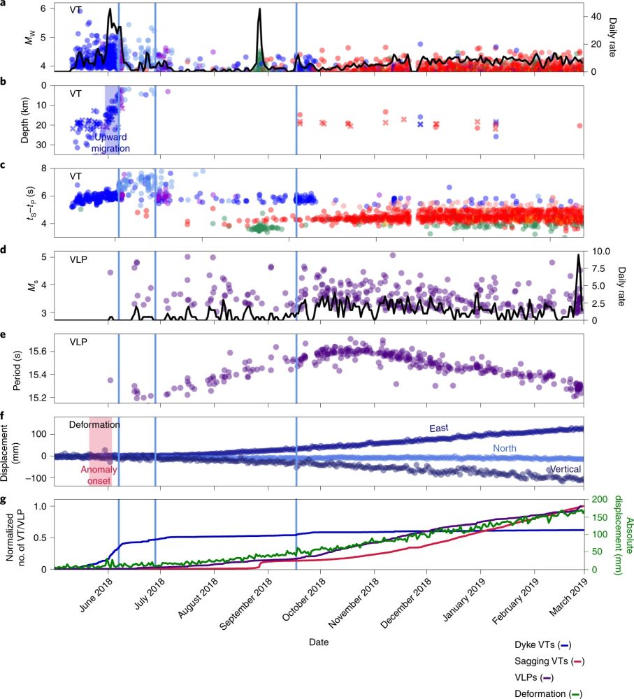 图2 岩浆活动相关的时间序列(Cesca et al,. 2020)。a.火山构造地震的震级(圆点)和日发生率(黑线);b.基于地震矩张量反演(圆点)和台阵分析(x)获得的火山构造地震深度;c. YTMZ站记录到的火山构造地震的S-P到时差作为到Mayotte岛距离的近似;d.VLP事件的震级(紫色圆点)和日发生率(黑线);e.VLP事件优势周期;f.GNSS的MAYG观测站去均值和去倾后的东倾和北倾与垂直向位移;g.与岩浆活动相关的火山构造地震(蓝线和红线)、VLP事件(靛蓝线)和MAYG站位移矢量长度(绿线)的归一化累积数
