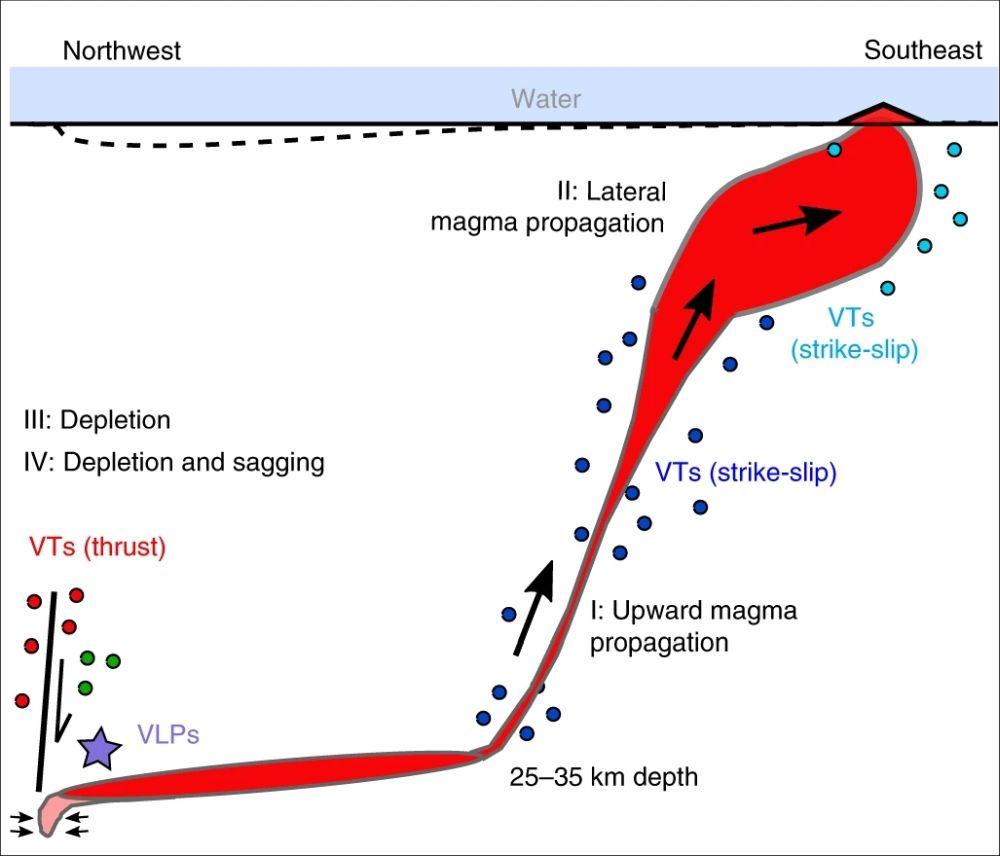 该研究认为马约特岛附近的深部岩浆活动过程可划分为2个主要活动阶段(图3):在第一阶段(第1-2期)发生的由深到浅向上迁移的较强地震群活动是岩浆从Moho面向地表运移过程的响应,第2期结束时间可能标志着海底岩浆喷发的开始;在第二阶段(第3-4期)同步发生的VLP事件和火山构造地震活动及相关的大规模沉降变形,则标志着大型岩浆储库的岩浆排出伴随着的岩浆储库围岩的逐渐破坏并触发共振而致。研究分析表明:在马约特岛和新出现的海底火山间存在长约15 km的近水平岩浆储库,该岩浆库的深度位于25-35 km,分析时段内至少有1.3 km3的岩浆排出。