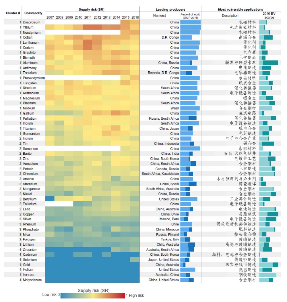 图2 美国2007-2016年间52种矿产品供应风险热力图,根据聚类分析分为四类,每种矿产品以蓝色为低风险和红色为高风险展示10年间供应风险情况(第一列),其中每种矿产品对应的领先产出国(第二列)和2016年最易受损的制造行业已标出(第三列,浅绿为最主要易损产业贡献度,深绿为其余产业贡献度),可以看出大多数矿产品的易损性往往受控于单一用途,如永磁材料对于钐、钕、镝、镨等稀土元素;少部分矿产品如铝和锡可能受控于多个制造业使用