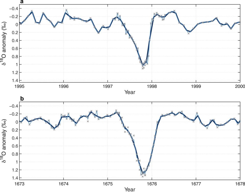 图3 印度洋东部珊瑚氧同位素记录的1997年(a)和1675年(b)pIOD事件(Abram et al., 2020)