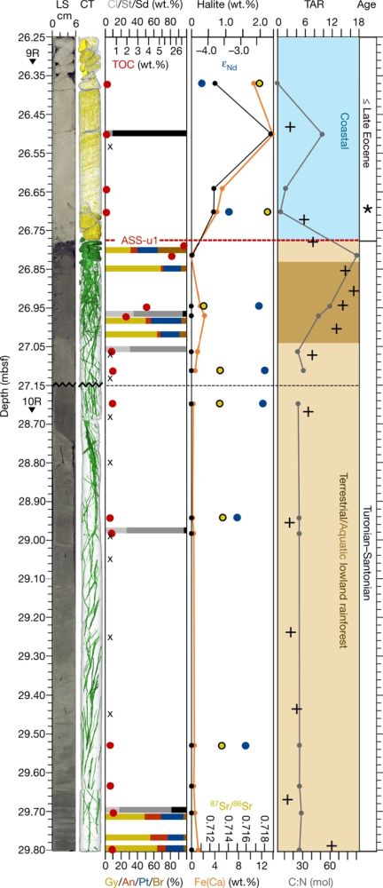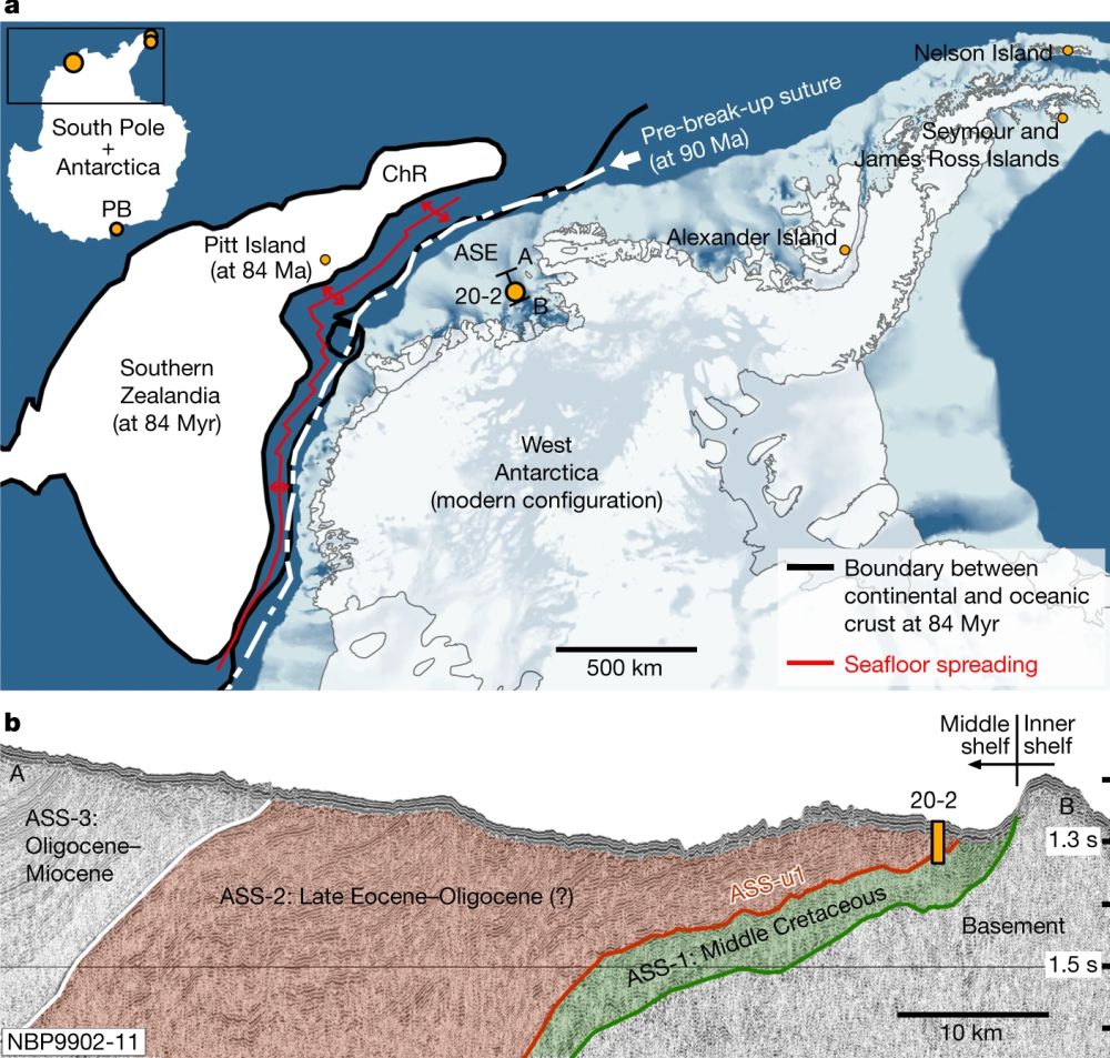 2017年,德国亥姆霍兹极地和海洋研究中心Johann Klages团队利用遥控机器人钻机,从西南极陆架上(古纬度~82°S)钻取了一个长约30 m的沉积岩心柱(图1)。基于生物地层学和古地磁学,该岩心柱底部近3 m的沉积序列的年代被限定到白垩纪中期(土仑阶-桑托阶:~92-83 Ma)。这为探索该时期南极大陆古气候和古环境演化提供了绝佳的研究材料。最近,Johann Klages团队通过对该岩心柱底部3 m的沉积物进行了多指标分析,系统重建了白垩纪中期南极大陆的古气候古环境,成果发表在Nature上。