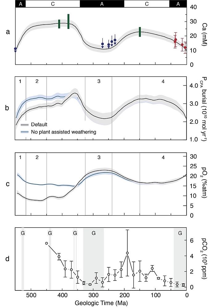 最后,研究人员通过对成岩模型与全球碳磷氧模型的耦合研究,进而揭示了海水钙含量对大气氧演化的影响,并提出了海水钙含量降低能造成大气氧含量的增加。该理论合理解释了显生宙以来大气氧含量的变化过程:例如,石炭纪出现巨型的昆虫等表明具有比现代高的大气氧含量(图3c),同时流体包裹体的数据揭示了该时期海水钙含量较低(图3a)。海水中钙含量的降低导致碳酸盐氟磷灰石埋藏的降低。在磷风化输入不变的情况下碳酸盐氟磷灰石埋藏的降低会导致有机磷和有机碳埋藏的升高,进而增加大气的氧含量。此外,研究人员认为寒武纪早期的大气与海洋氧含量的降低也可能与海水中的钙含量升高有关 (图3)。
