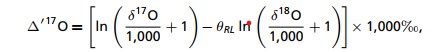 地史时间尺度上,地球大气圈在生物和地质营力的双重驱动下,逐渐由缺氧演化为富氧状态,但对于其演化机制还存在很多认知不清的环节(Holland,2009)。其中,最关键的问题在于缺乏古大气中氧气浓度(pO2)直接可靠的代用指标(Lyons et al., 2014)。近年来,随着对地质记录中氧同位素非质量分馏理论认识的加深(Bao et al., 2000, 2008, 2009),海洋沉积记录中硫酸盐的三氧同位素(用Δ'17O来表示,见公式1,式中θRL=0.5305,为平衡体系质量依赖分馏线斜率)成为古大气pO2的重要代用指标。