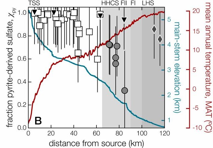 为了认识以上问题,哈佛大学地球与行星科学系Jordon Hemingway等研究人员通过喜马拉雅山南坡河流溶解性硫酸盐17O同位素的非质量分馏(Δ'17O)、传统硫氧同位素以及河流水化学分析,对地表风化过程中流域硫酸盐和硫酸盐中氧的来源开展了溯源研究,并对黄铁矿氧化形成硫酸盐的机制进行了探讨。